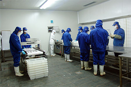 本公司是一家以水產(chǎn)品加工為主的出口型企業(yè),于2004年9月建成并正式投產(chǎn)。公司廠房完全按照歐洲聯(lián)盟的標(biāo)準(zhǔn)設(shè)計(jì)施工,目前占地14000平方米,建筑面積8000平方米,其中加工車間1600平方米。公司日速凍能力達(dá)100噸,儲藏庫容量為5000噸,主要加工蟹類、貝類、頭足類及魚蝦類水產(chǎn)品,產(chǎn)品銷往日本、東南亞及歐盟地區(qū)。